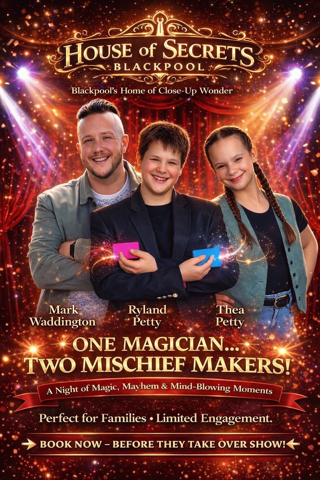 Starring professional magician Mark Waddington alongside rising young performers Ryland Petty and Thea Petty, the show promises jaw-dropping illusions, quick-fire comedy and high-energy family entertainment inside one of Blackpool’s most intimate theatre settings.